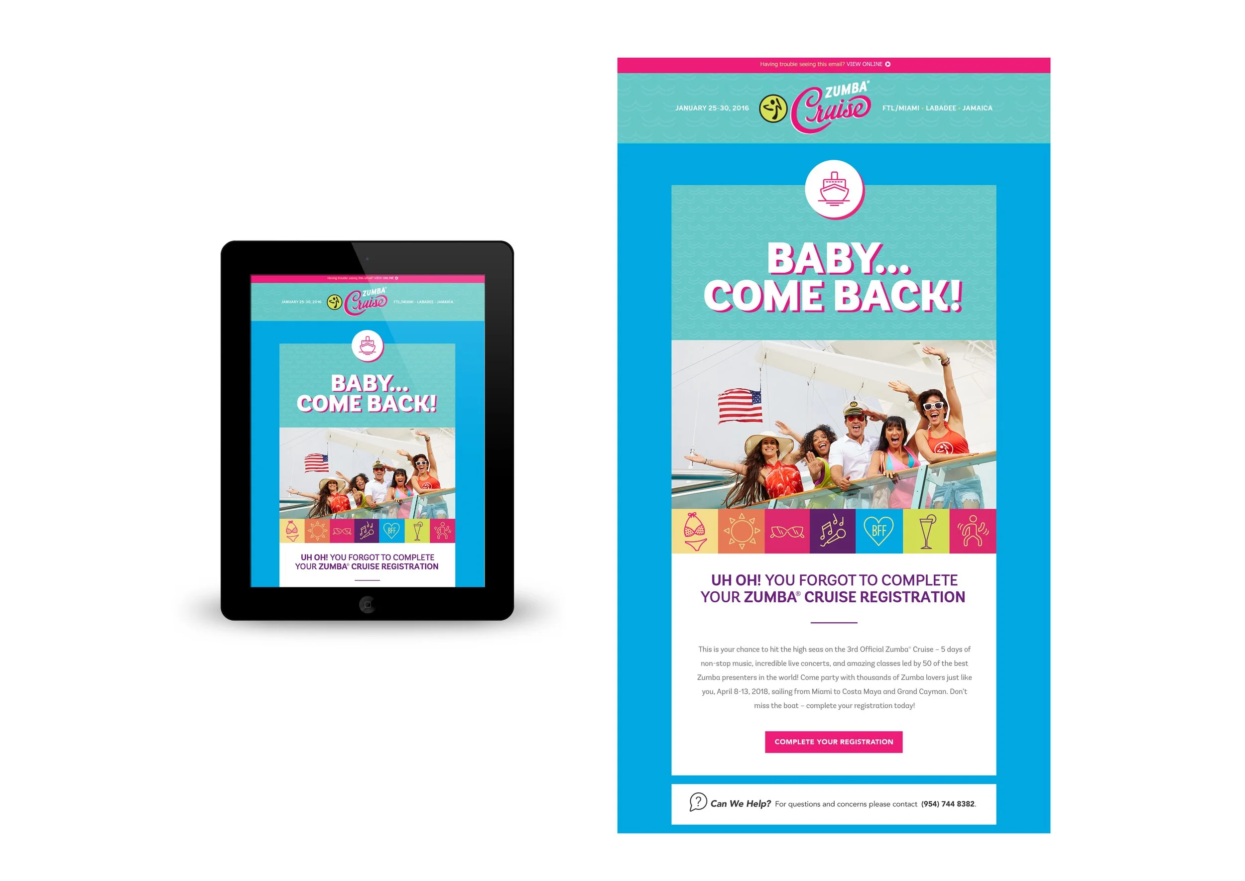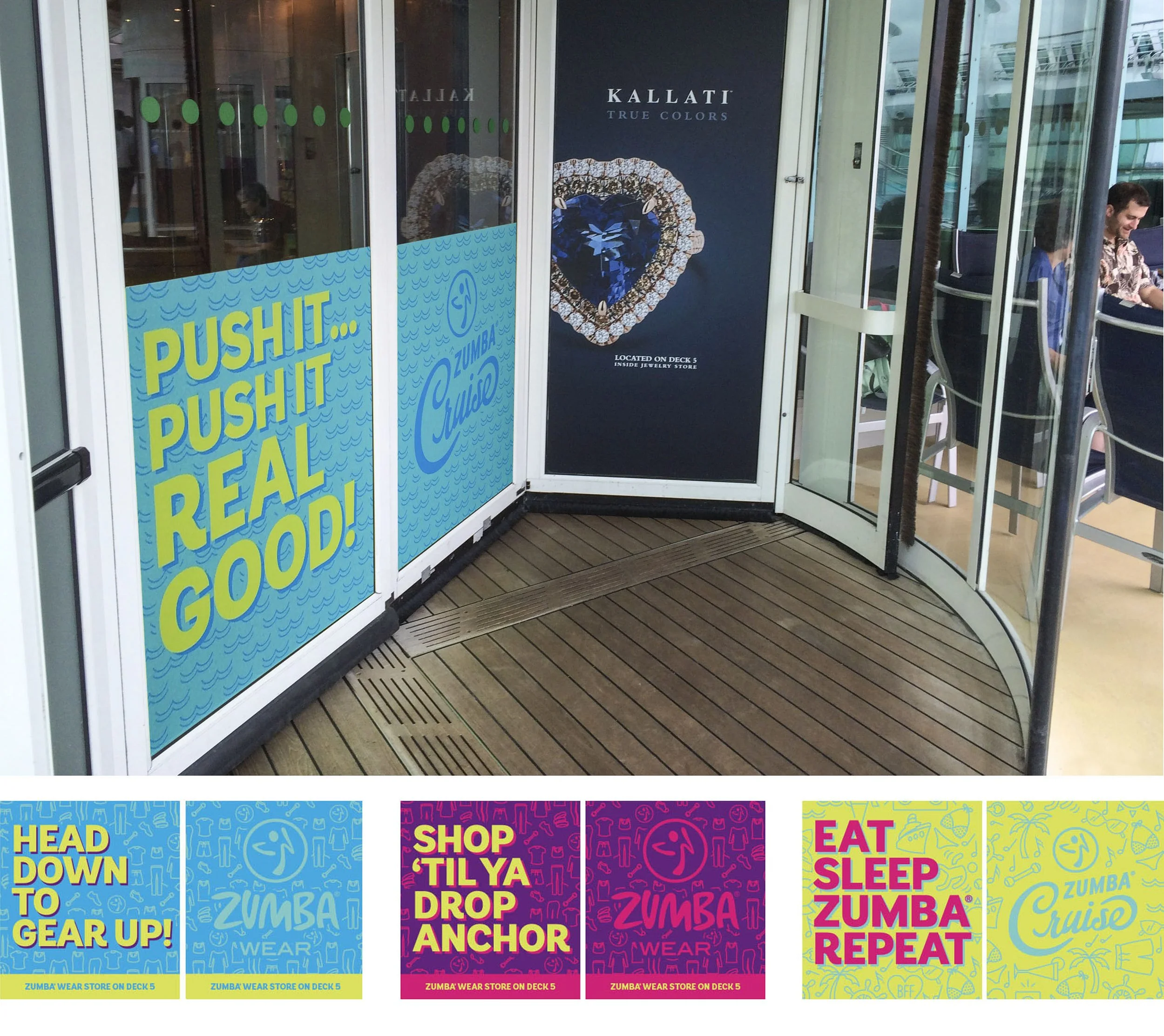 The Zumba® Cruise brings the fun and fitness of Zumba classes to a vacation at sea. Zumba partnered with Royal Caribbean Cruises to host a party on a ship with music, various dance classes and thousands of Zumba enthusiasts. I provided my Graphic Design skills to this monumental project that included Marketing Materials: email, social media posts, landing page as well as large scale on-site Signage and Branding for the Ship.