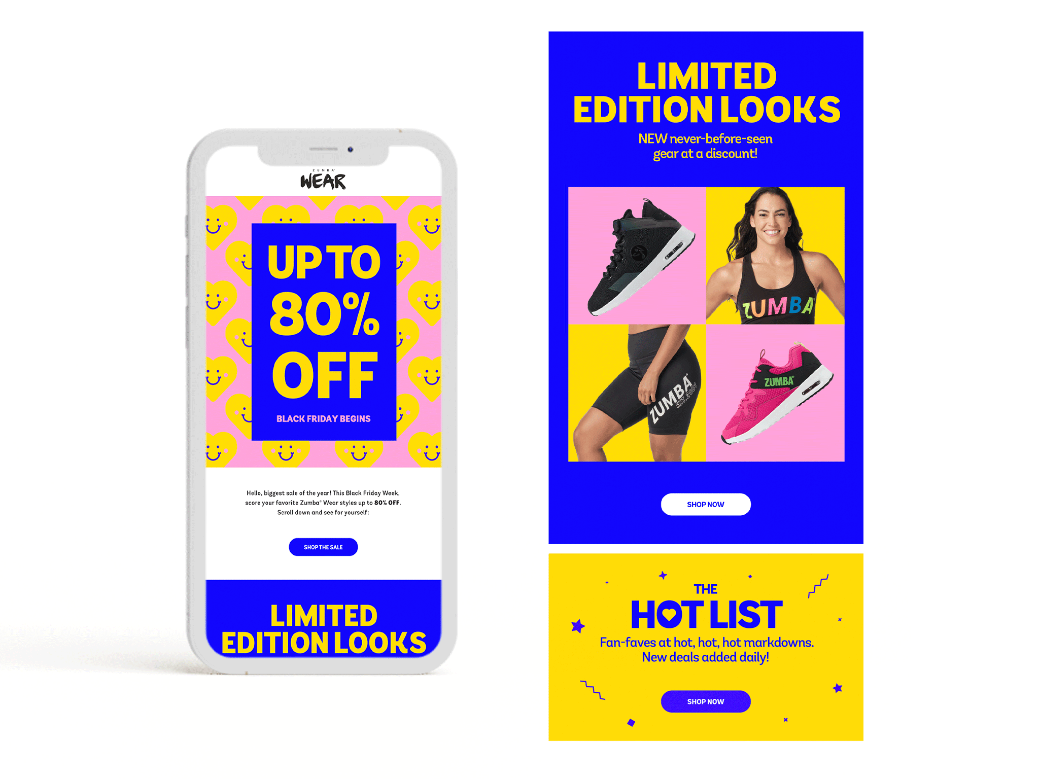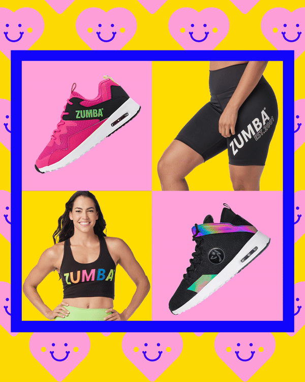 This cheerful marketing campaign for Zumba® Wear featuring animated hearts and lightning bolts promoting the Black Friday + Cyber Monday 80% off sale. Marketing assets include email journey, webpage takeover, social media posts and a flyer to be sent with packaging.